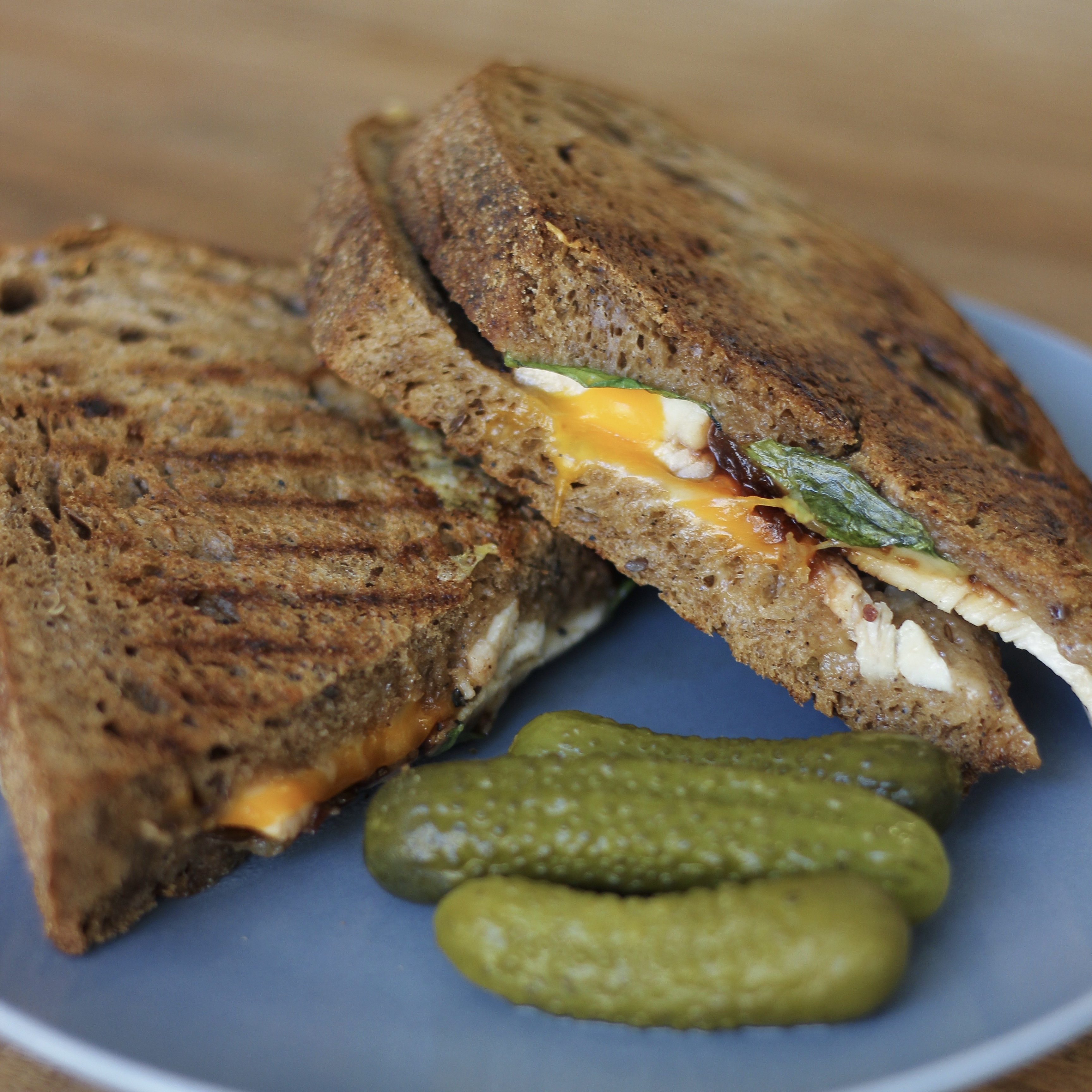 Хліб (вода очищена,борошно в/с, борошно житнє органічне, борошно цільнозернове, закваска органічна (вода очищена, борошно пшеничне цільнозернове, органіка, борошно в/г органіка), клейковина пшенична, сіль морська, дріжджі), сир Чеддер, сир Пармезан, карамелізована цибуля, соус із журавлини, м’ясо індички.